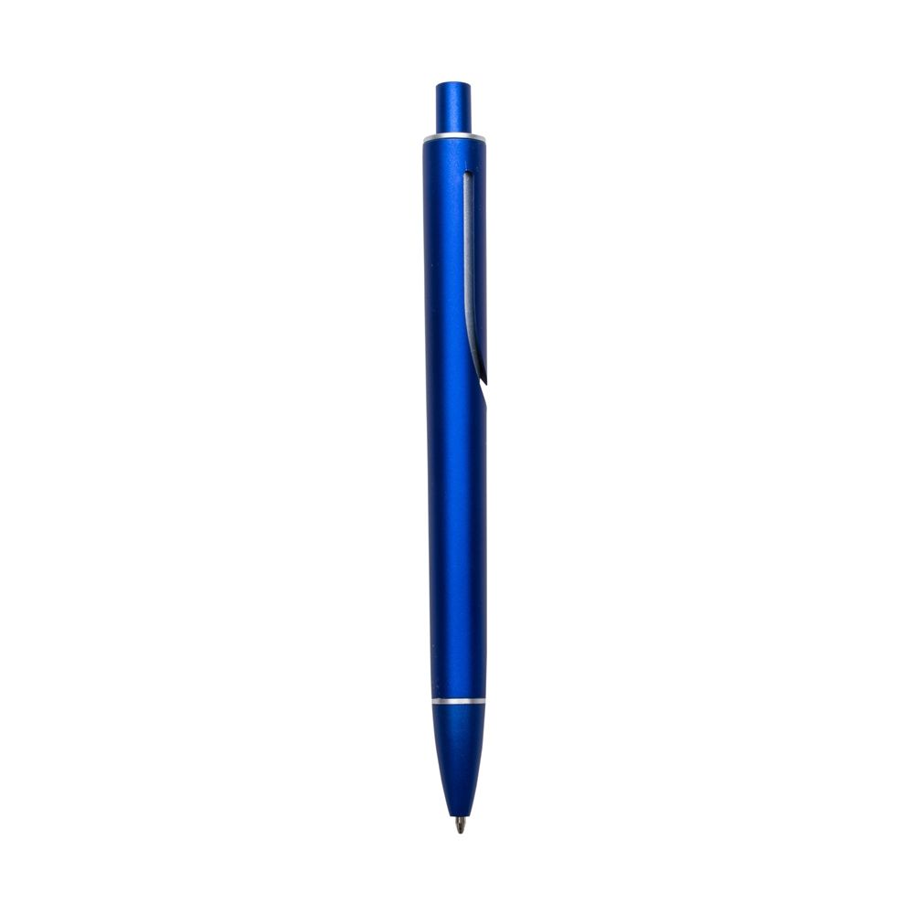 Caneta plástica inteira colorida com detalhes prata. Clip "acoplado" ao corpo da caneta, possui anel superior e inferior prata. Aciona por clique.