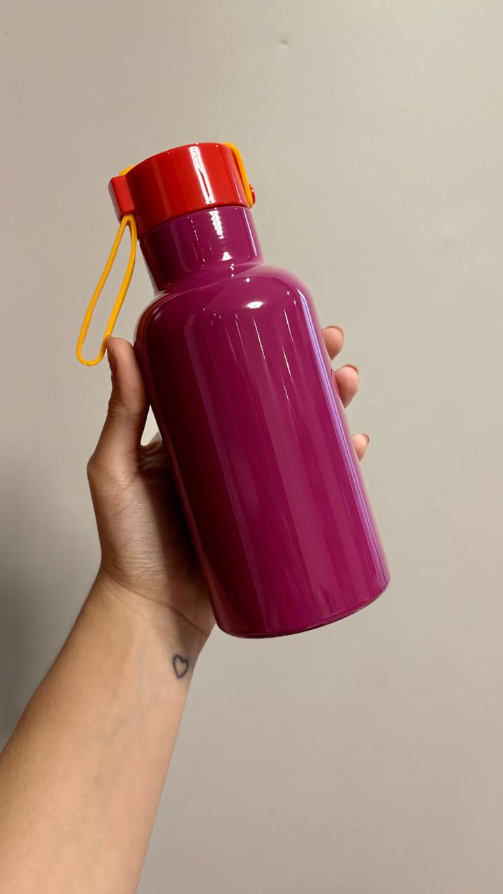 Descrição: Garrafa térmica de inox 380ml. Contém tampa rosqueável e alça colorida de silicone acoplada na tampa.